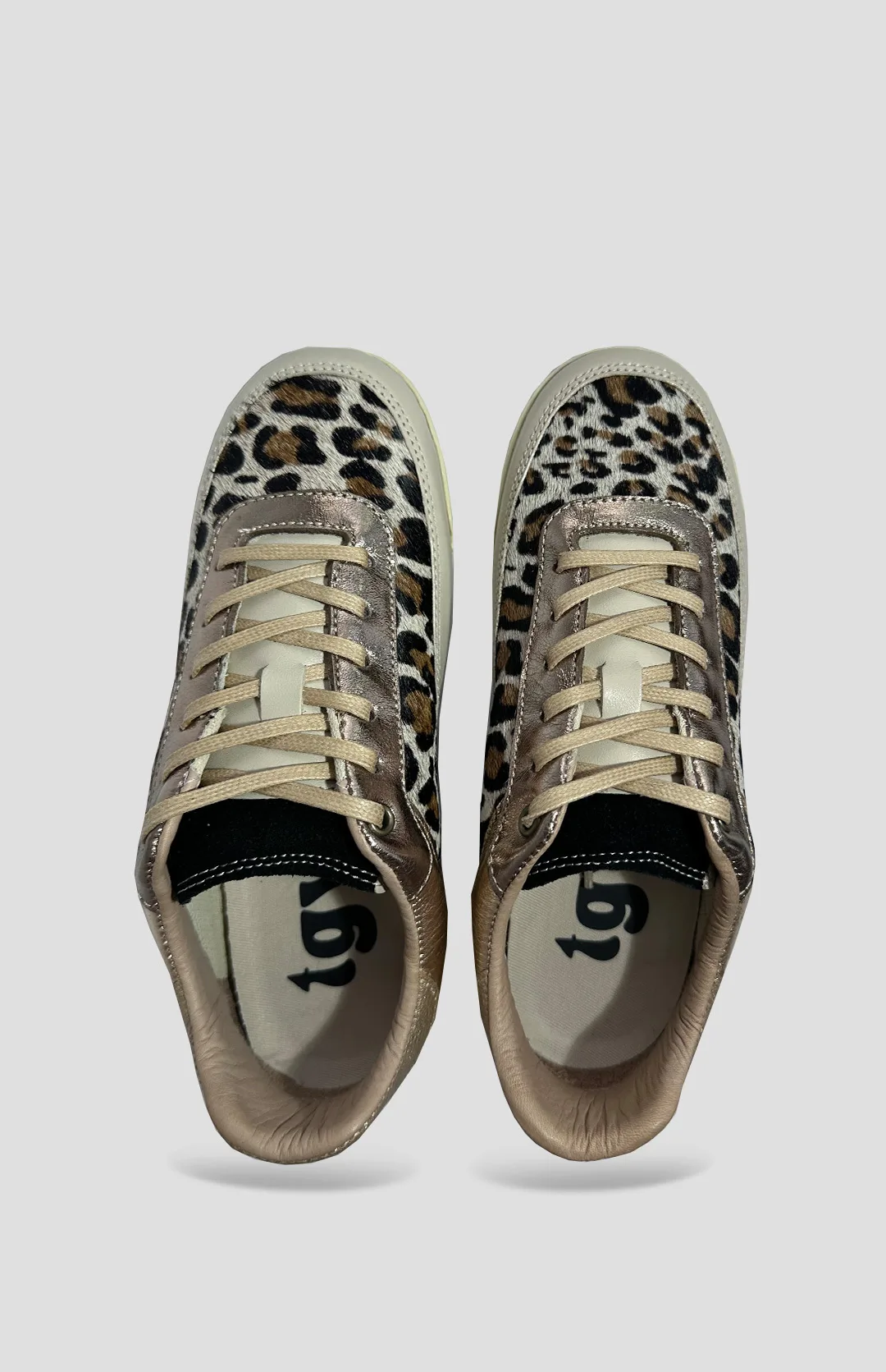Tenis en cuero con estampado animal print y aplique dorado y con suela de caucho que permite mayor durabilidad.