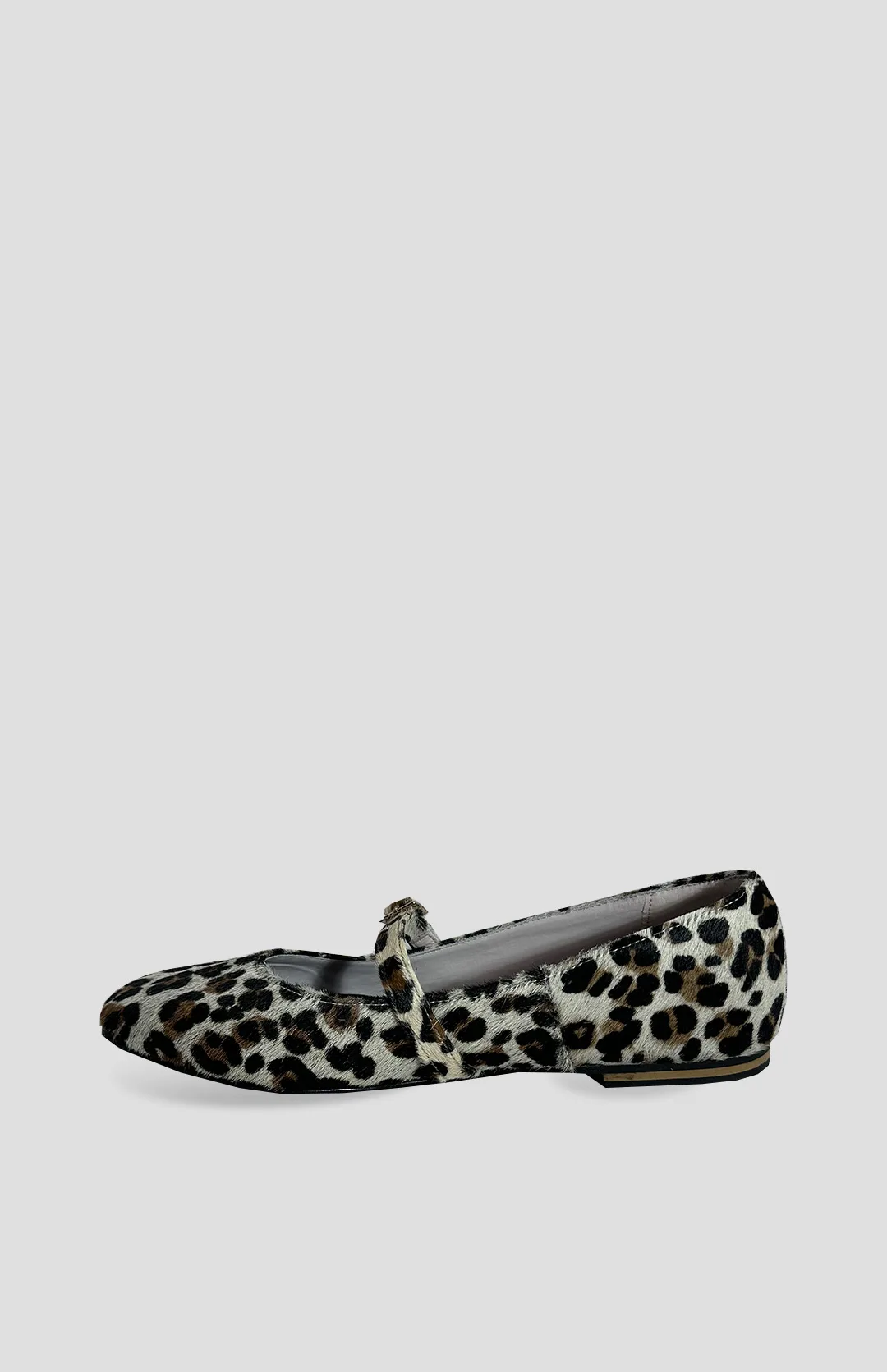 Mocasín en cuero con estampado animal print y con suela sintético que permite mayor durabilidad.