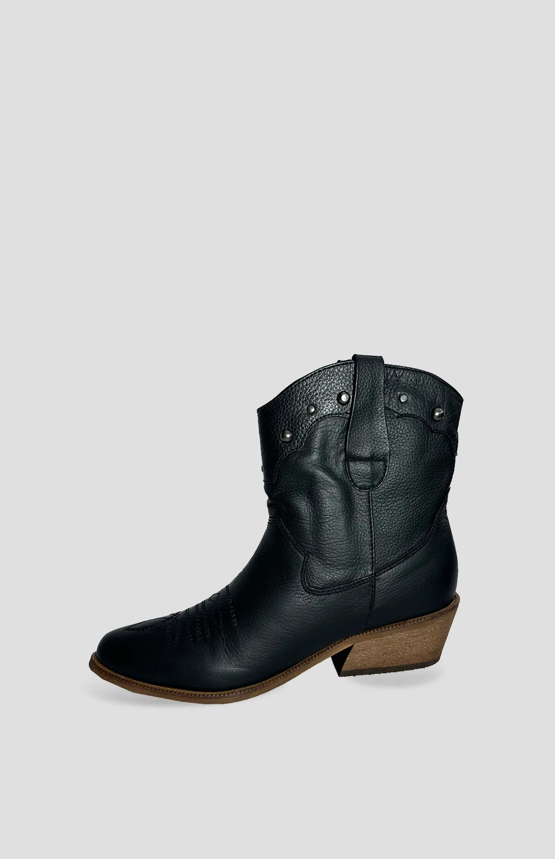 Bota caña baja en cuero con taches y tacón 3 centímetros.