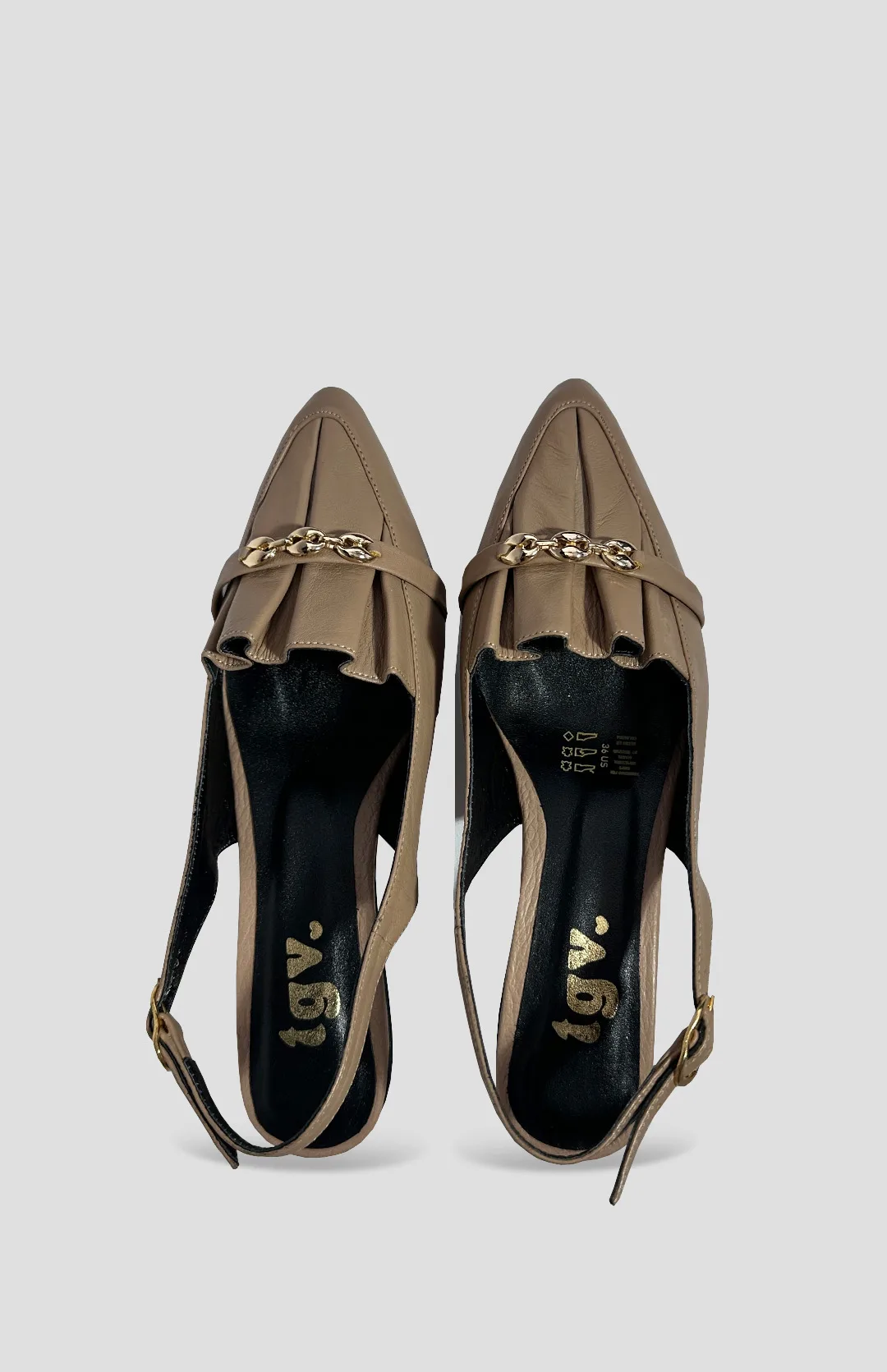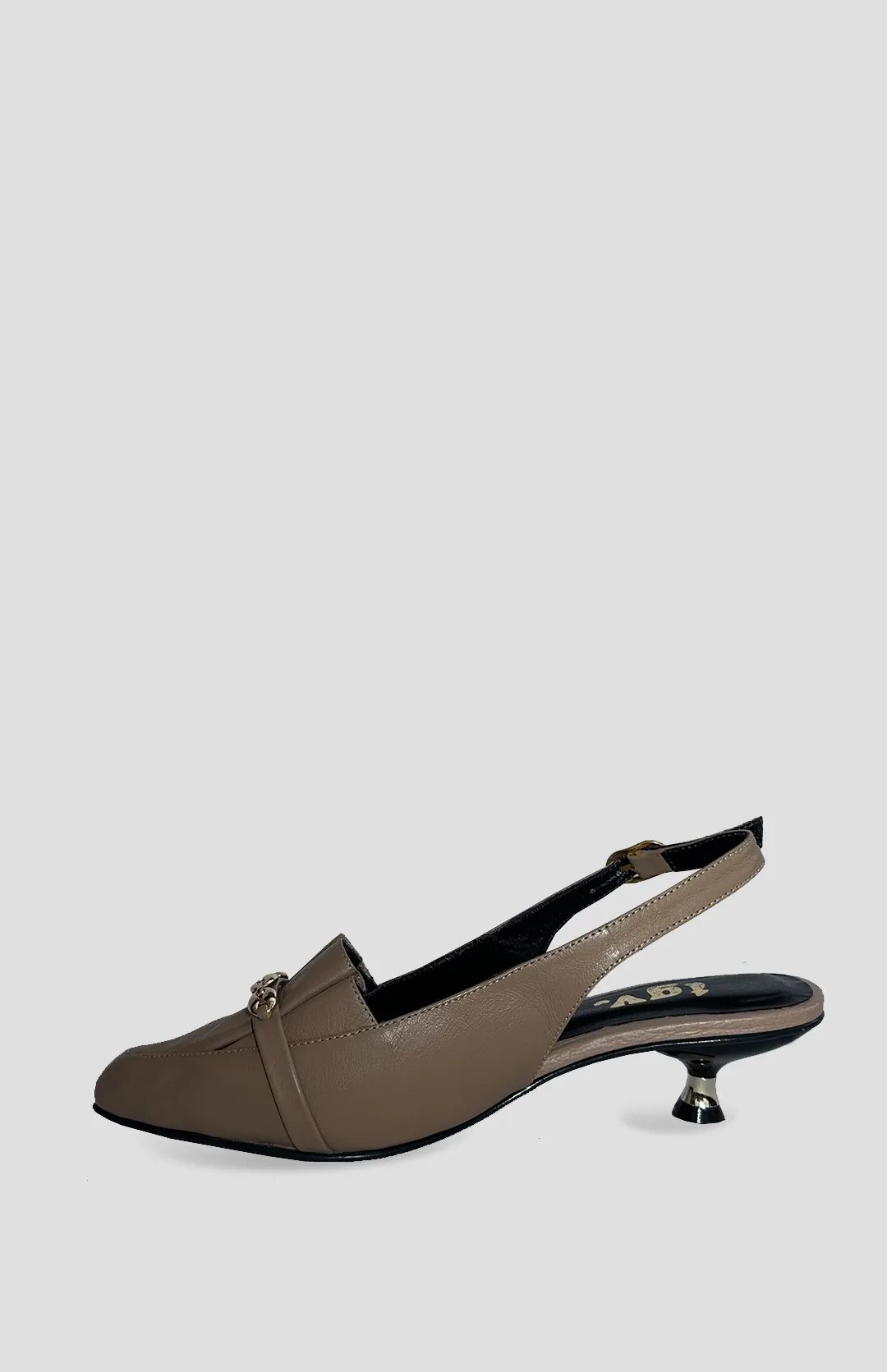 Tacón en cuero con aplique dorado, con correa y tacón de 3 centímetros.