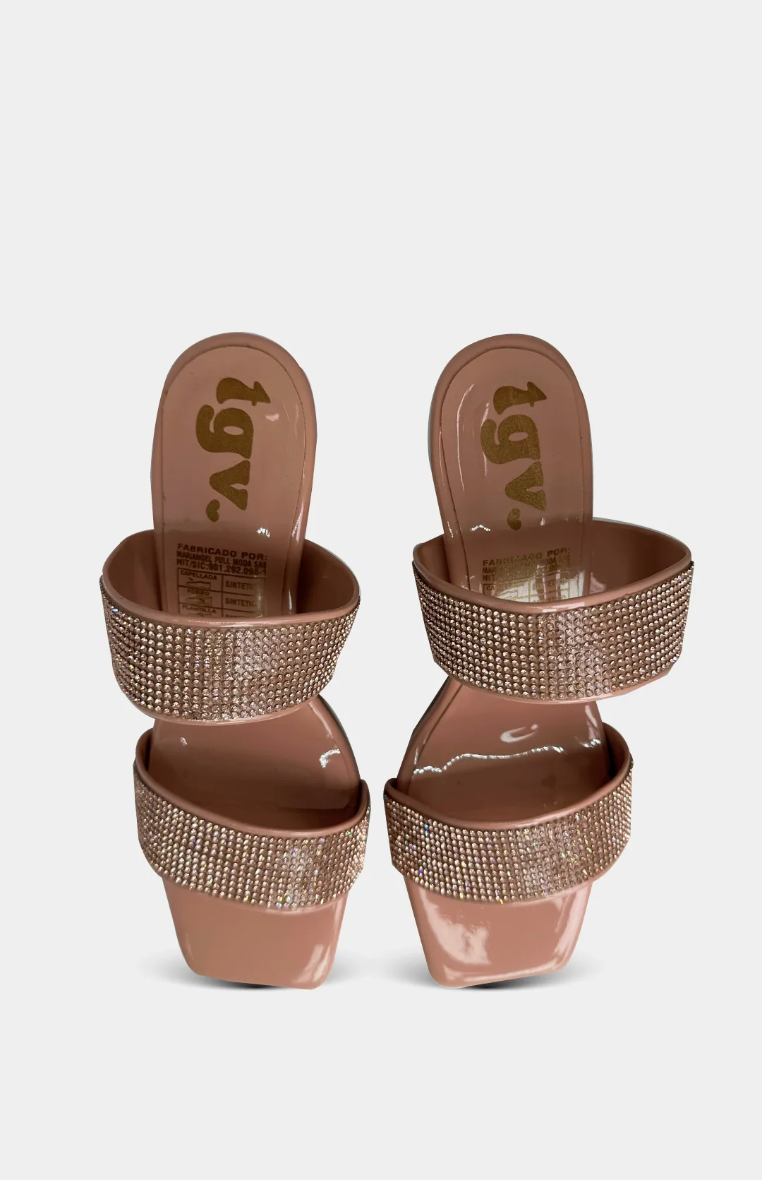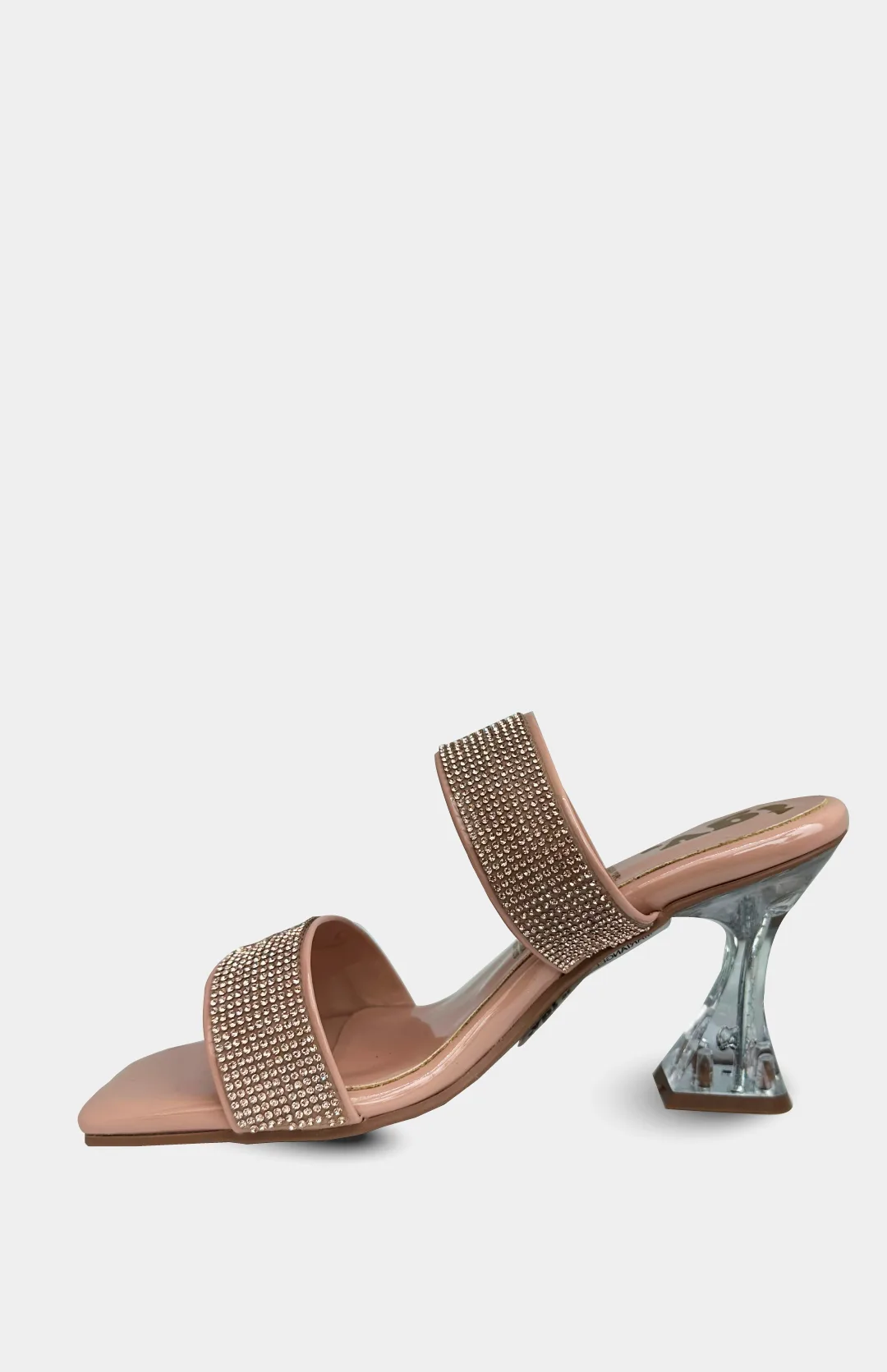 Tacón en sintético con apliques brillantes, con suela pvc que genera durabilidad y tacón transparente con altura de 7,5 centímetros.