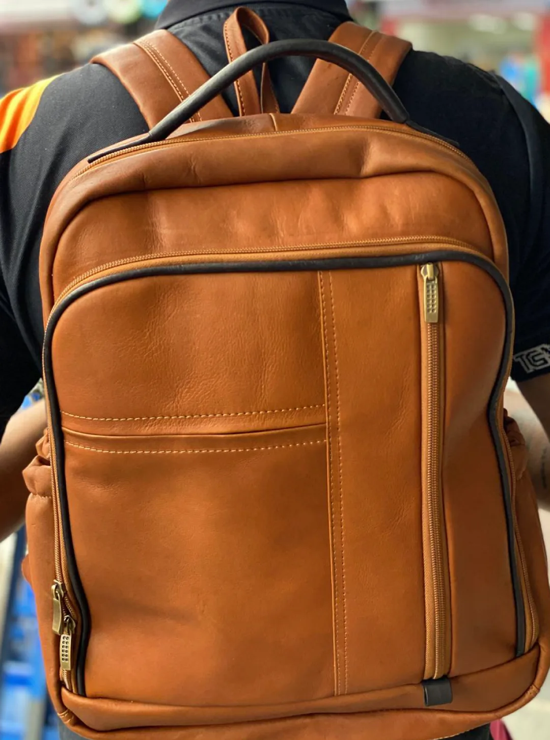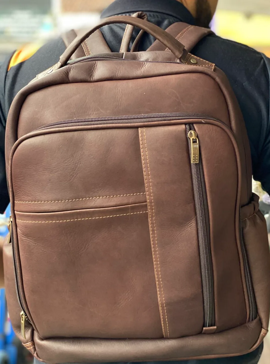 Morral en cuero con varios compartimentos internos y correas.