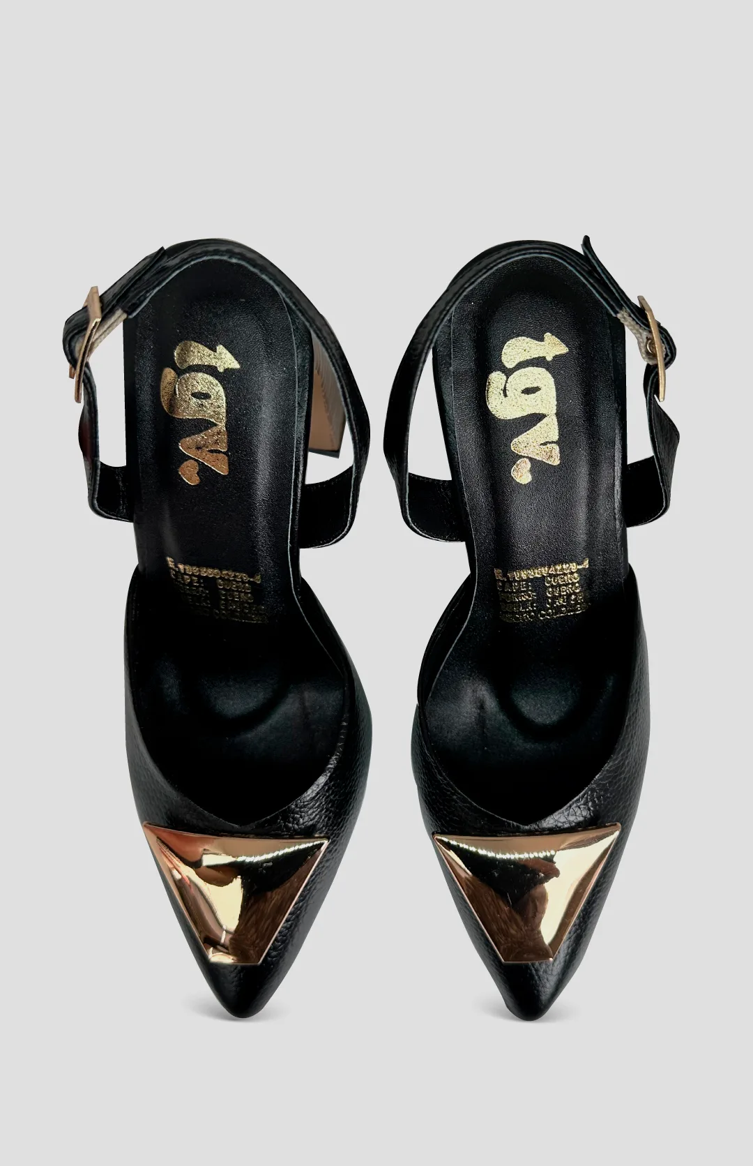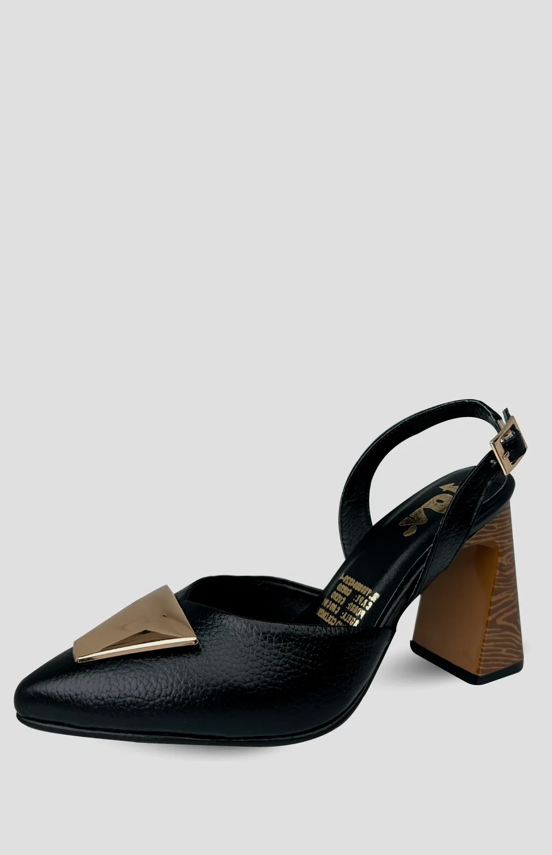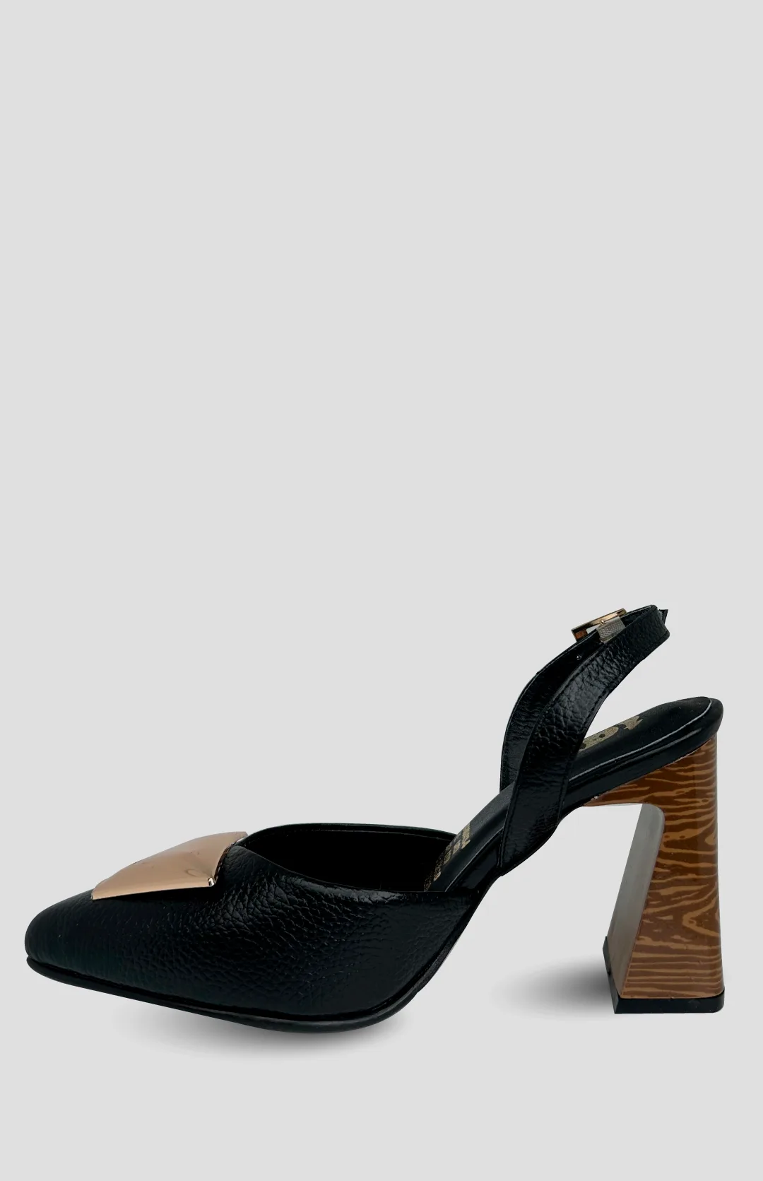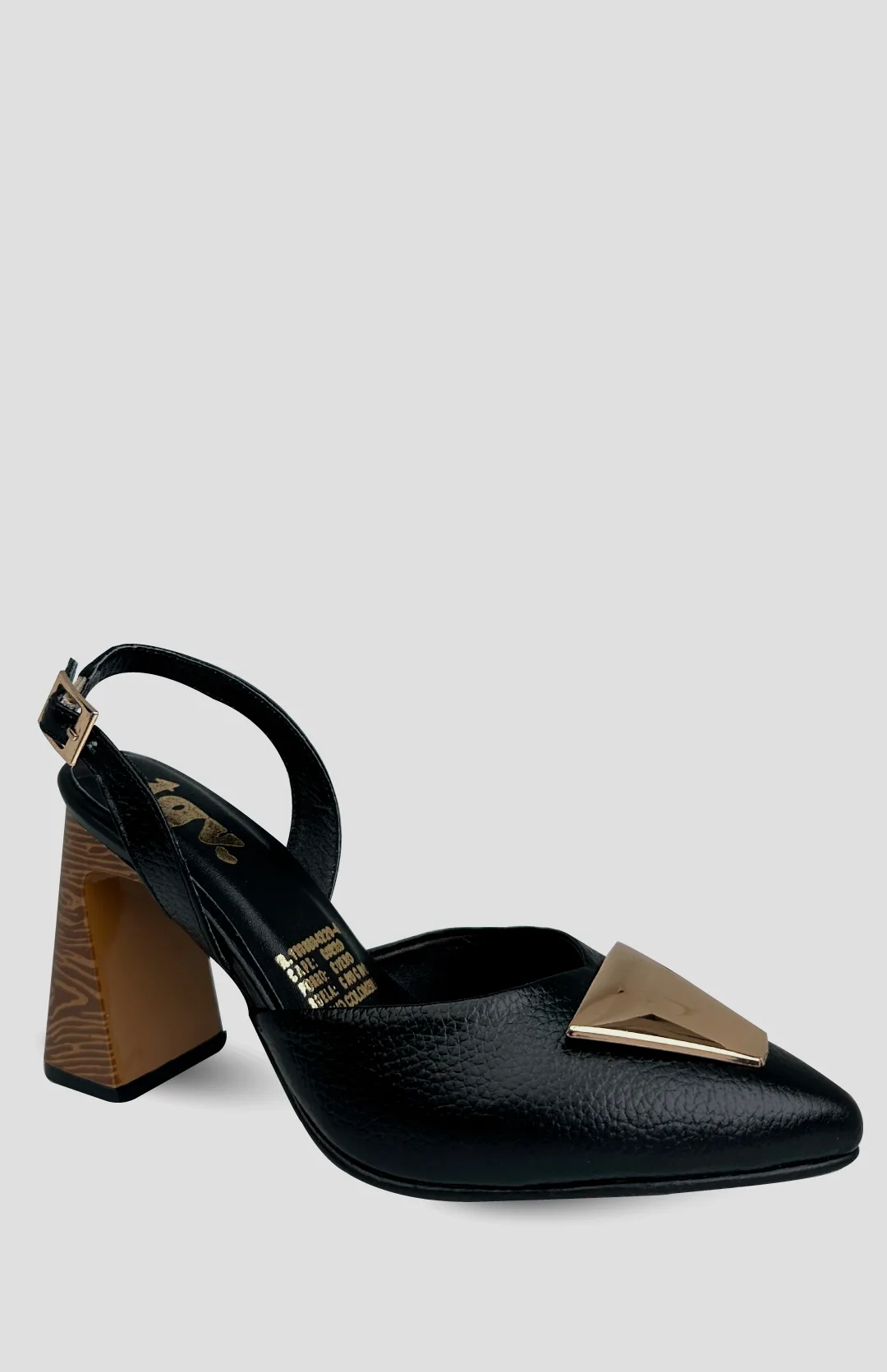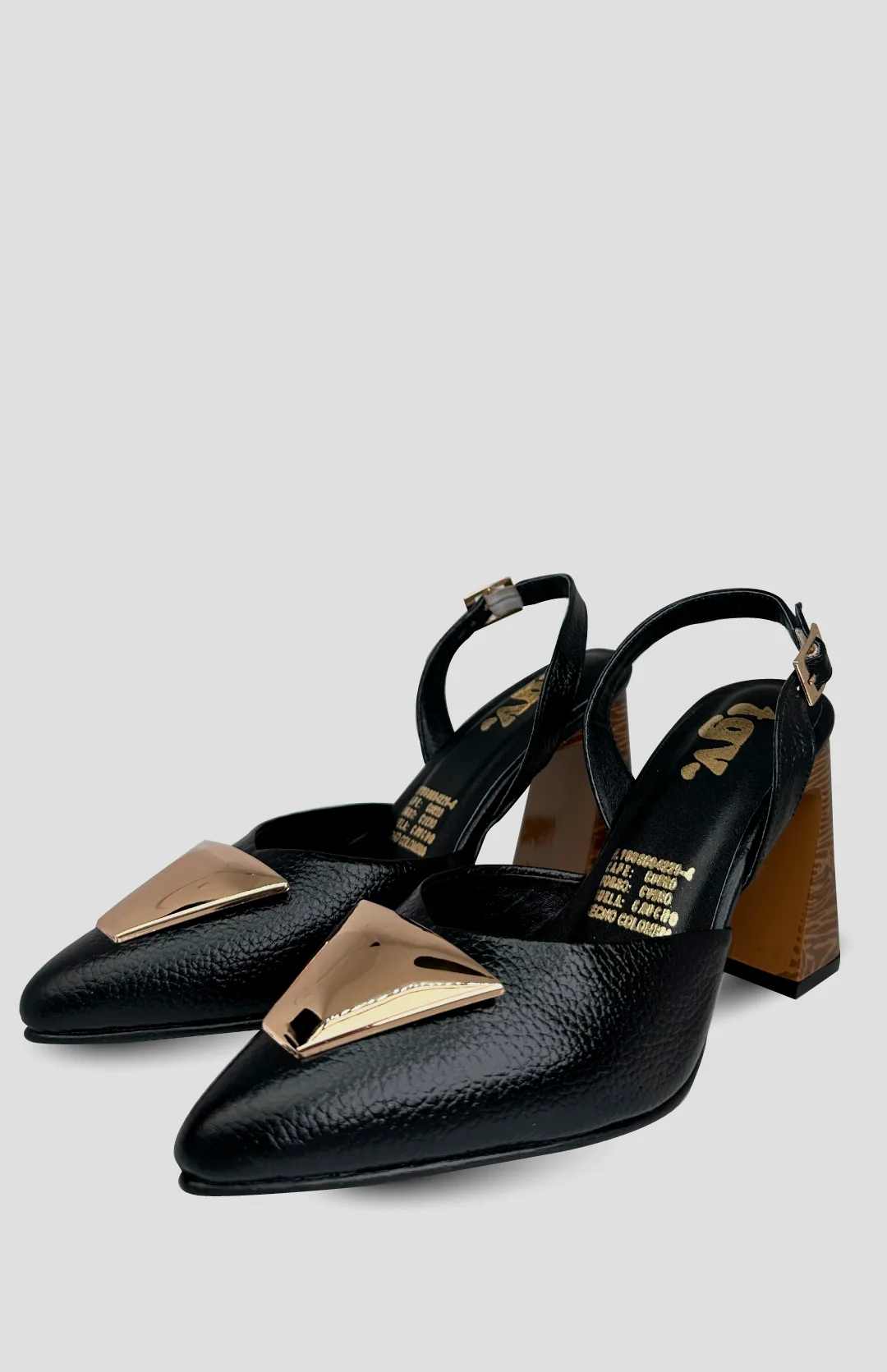 Tacon en cuero texturizado, con aplique dorado y correa, con suela de caucho y tacon 7,5 centimetros.
