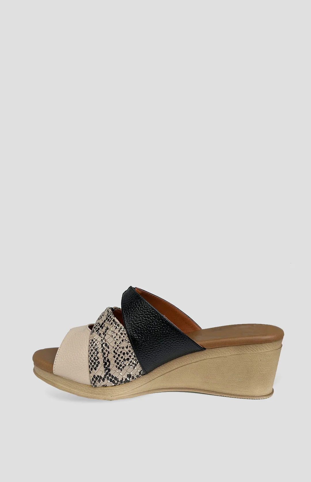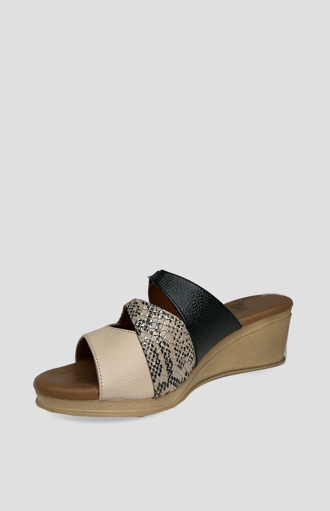 Plataforma en cuero multicolor, con suela en poliuretano que permite ligereza.