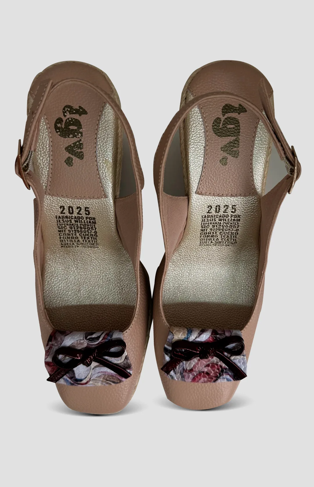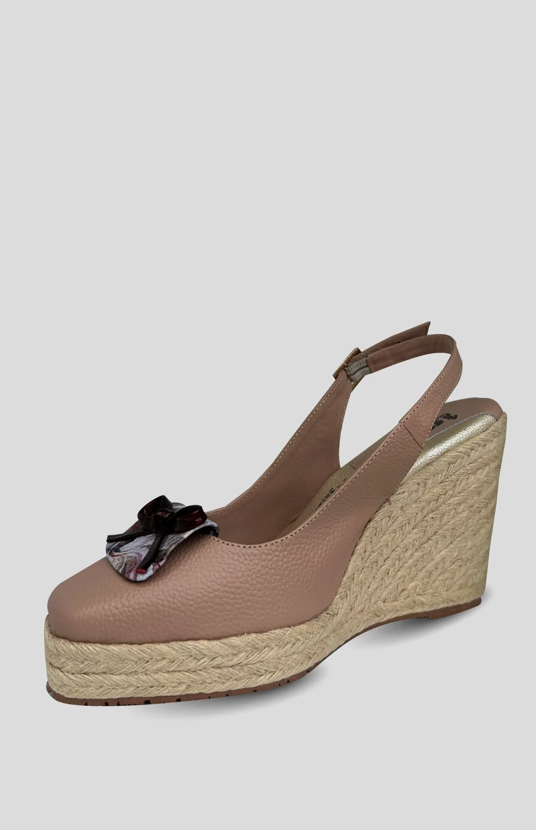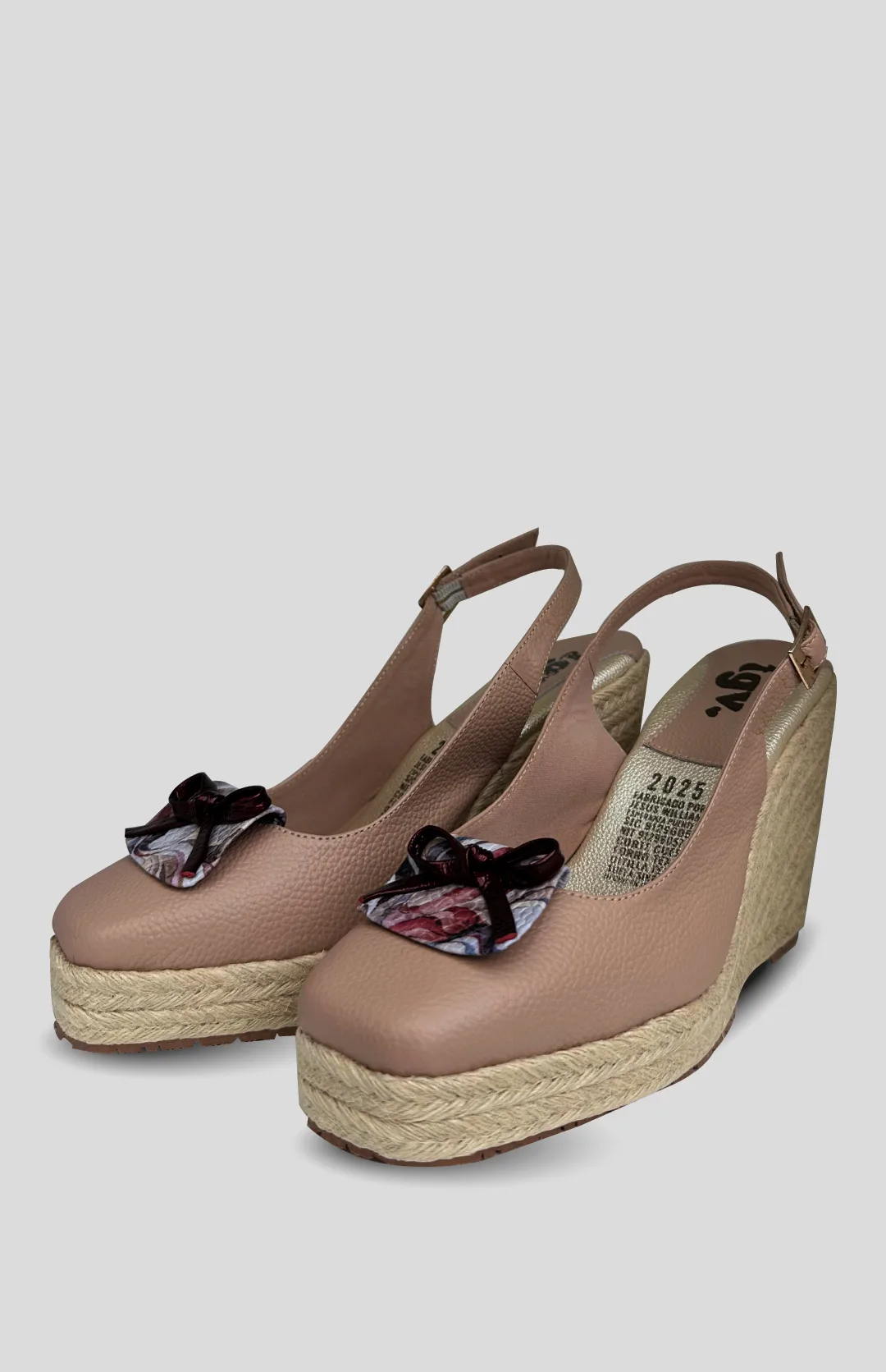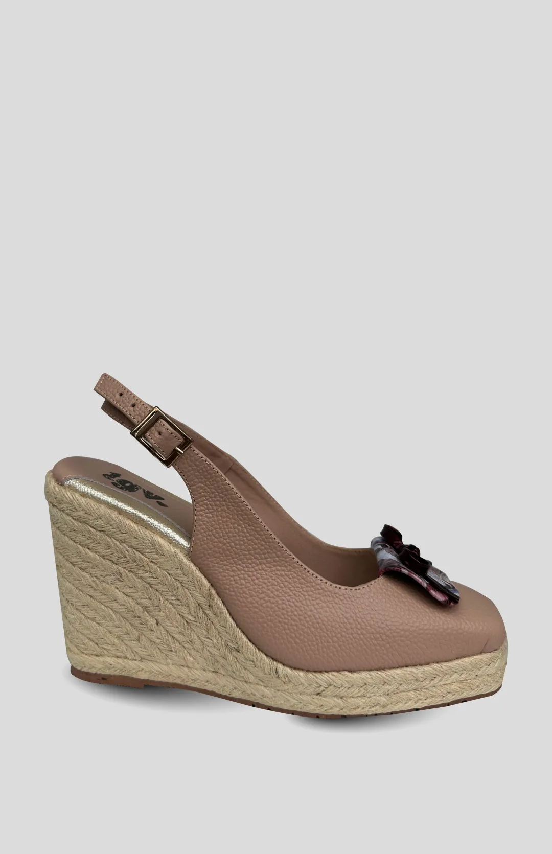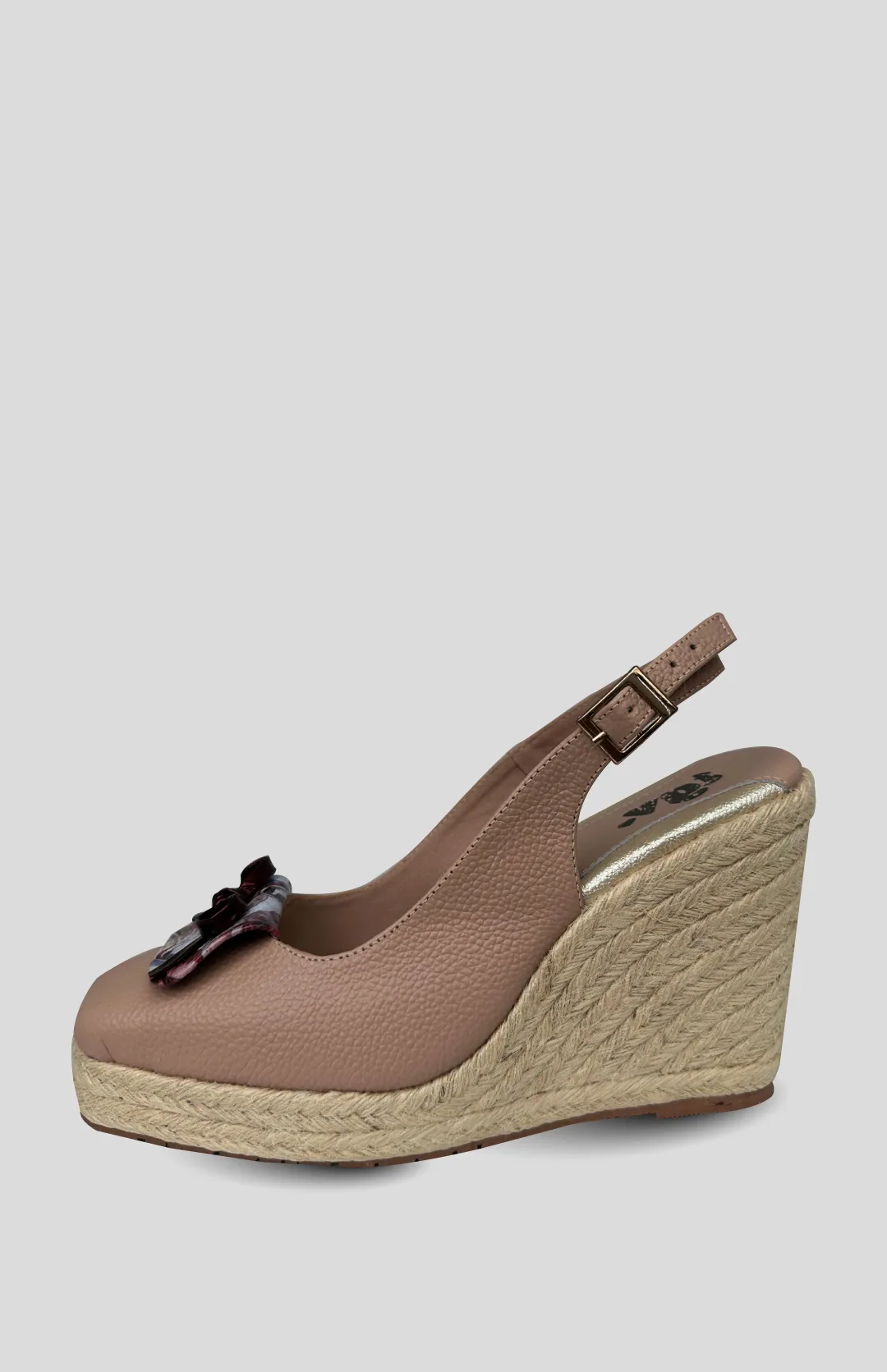 Tacon en cuero con aplique estampado, suela sintetica en yute y altura de 10 centimetros.